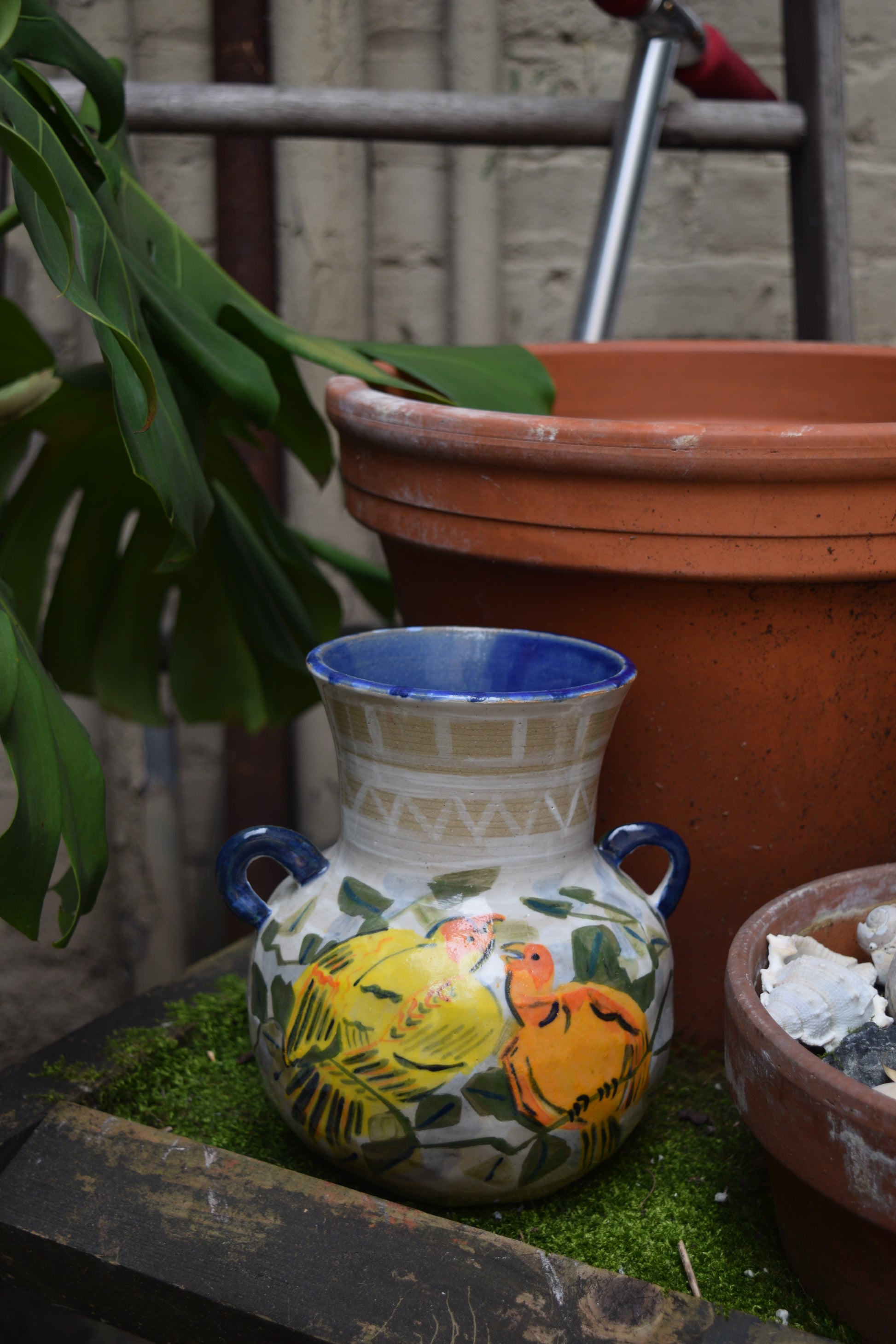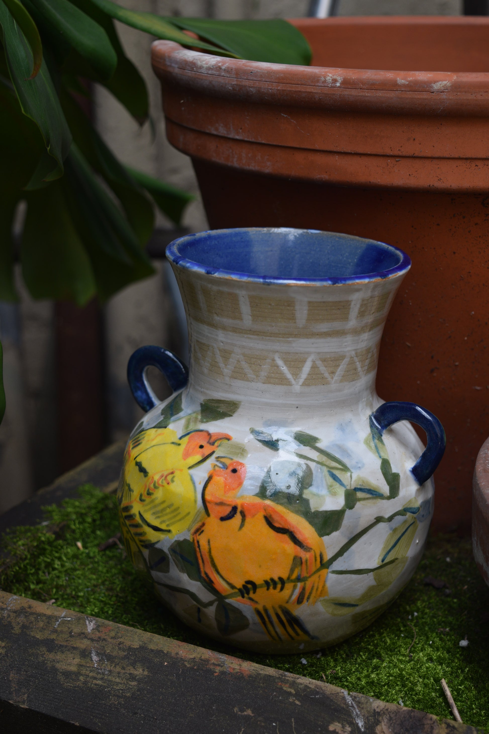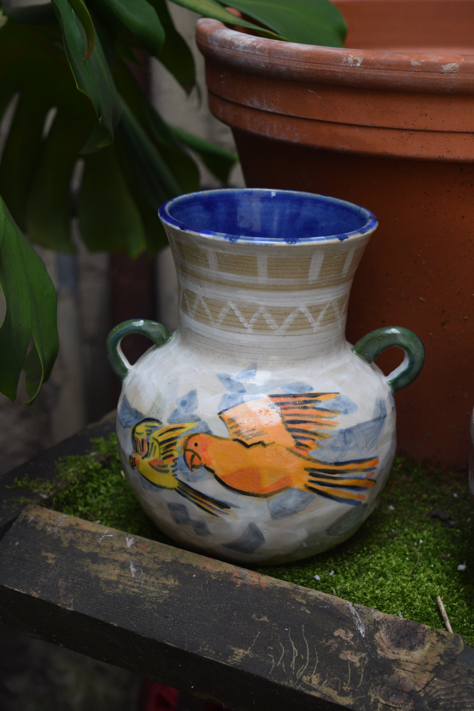 -Materials/technique: Wheel thrown, stoneware, hand-painted and carved, fully glazed.